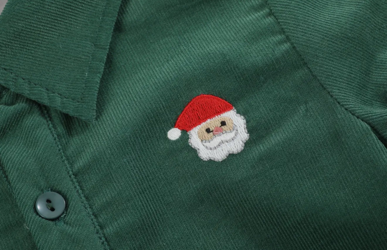 Dress your little gentleman in timeless style with our Green Corduroy Santa Dress Shirt. This charming button-up shirt features a classic santa embroidery on the most perfect green corduroy, offering a smart and playful look. Perfect for any occasion these upcoming holidays, this shirt effortlessly combines comfort and dapper sophistication, making your young man stand out with a touch of tailored elegance.